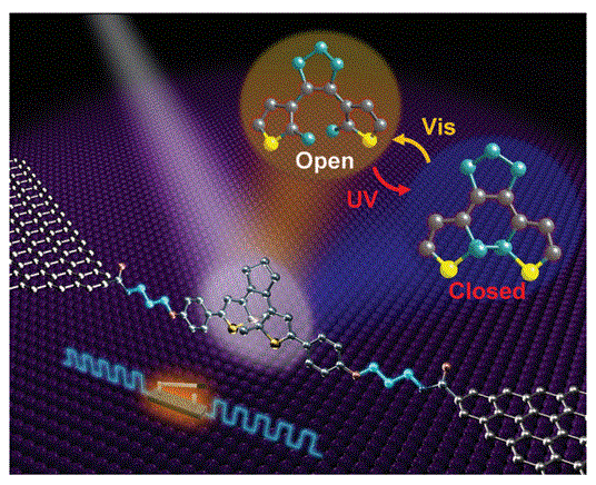 利用分子工程,将单个二芳基乙烯以共价结合的形式夹放于石墨烯电极中间,从而形成稳定的分子传导结。我们对这些单分子结的实验和理论研究均显示且解释了:室温下可逆的光控导电开关和低温下根据不同导电状态随机切换。Jia等研究人员展示了一种双模式完全可逆的单分子电开关,其具有空前精度(开关比约为100),稳定性(超过一年),和可再生性(46个实验器件的光控开关循环次数可以超过100,随机开关循环次数约为105到106)。(Science DOI: 10.1126/science.aaf6298)