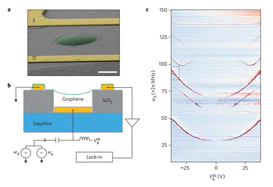 机械谐振器在现代信息技术中无处不在。因为很有可能可以将它们耦合到电磁和等离子状态,所以它们很有希望成为未来量子信息技术的关键组成部分。基于石墨烯的谐振器具有高谐振频率,具有多种机械模式和低质量的特点,因而引起了人们的关注。谐振器各种模式之间的张力调节的非线性耦合可以通过可控的方式来激发。印度的Deshmukh小组设计了一种石墨烯谐振器,在低温下其宽频带可调,从而具有很大的多模耦合强度。他们分别观察了新的本征模的出现和用红色和蓝色参数激励的耦合模式的放大,并论证了动力学多模式耦合是可调的。在强耦合机制下实现了60种模式的协同,其中两种谐振模式之间的频率间隔约为100MHz。动态调整机械系统中的高频本征模之间耦合的实现打开了低温下量子力学实验的可能性。(Nature nanotechnology DOI:10.1038/NNANO.2016.94)