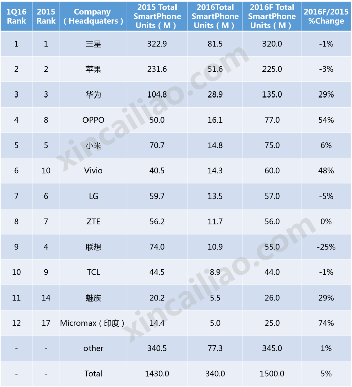2016年第一季度世界智能手机销售量排名
