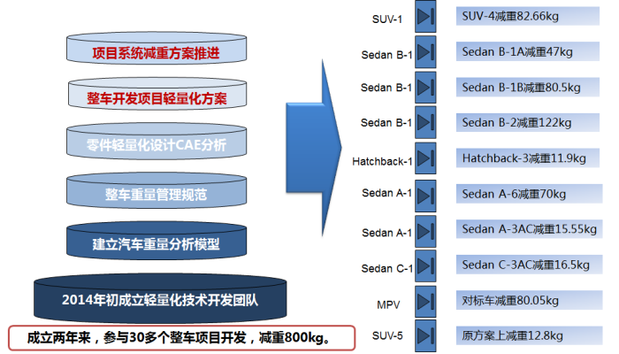 目前轻量化团队参与吉利30多个整车项目的开发,从2014年至今,已经实现减重800kg。