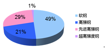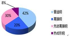 高强钢已经在吉利车型上大量应用,如博瑞相比吉利老款车型,普通钢应用从49%下降到42%,其中热成型钢应用比例高达8%。
