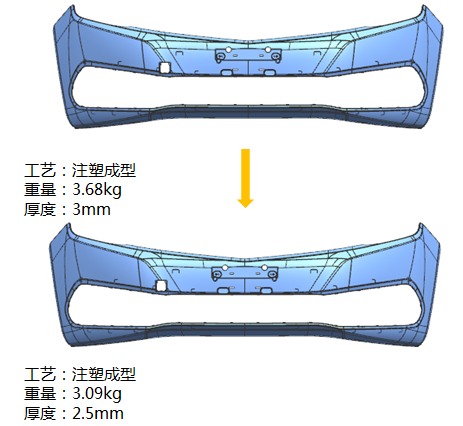 目前吉利所有项目都采用薄壁化保险杠,采用高性能材料,在保证保险杠刚性的条件下,将前后保险杠壁厚降到2.5mm,实现单车减重约1kg。