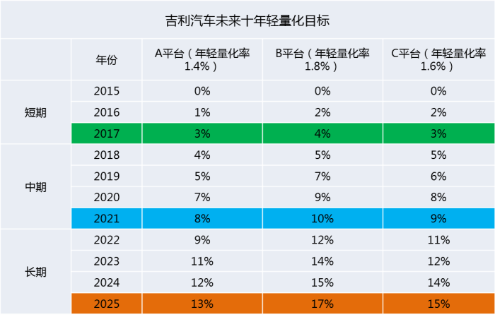 吉利汽车未来十年轻量化水平在自主品牌中处于领先地位,与合资及进口品牌位于同一水平或者小幅超越。以此为前提,设定吉利汽车各平台轻量化未来十年发展目标。