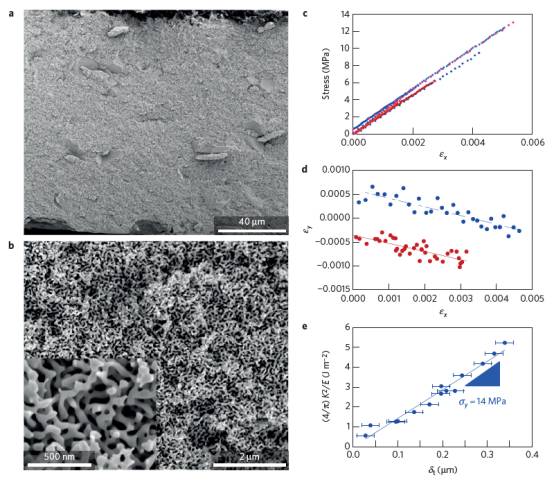 当金属合金暴露于腐蚀性环境中时,会自发形成纳米级多孔结构,这反过来又会给合金的机械性能带来影响。这种应力腐蚀破裂常见于核电站中的黄铜和不锈钢。对此一种解释是,在多孔层中发生高速的断裂,接着会影响到非多孔的主体材料中。 Sun 等人使用高速摄像机和数字图像关联法,研究了纳米多孔金动态和静态的断裂过程。实验结果表明,在典型的形成多孔结构的电化学电势下,这些结构的断裂速度达到 200m s-1 。(Nature Materials DOI : 10.1038 / NMAT 4335 )